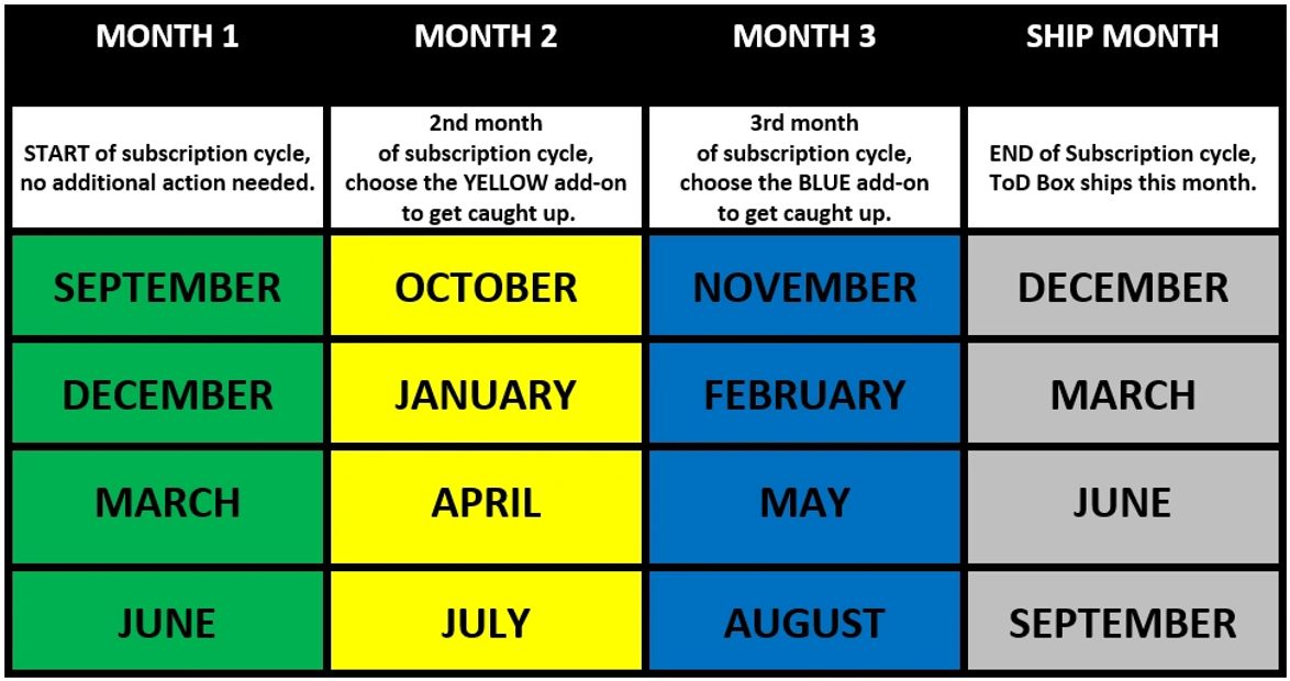ToD Box Subscriptions ship QUARTERLY. As a subscriber you will receive one hand selected, displayable specimen per quarter. Treasures-of-Darkness will work directly with suppliers, oftentimes directly with mine owners, to provide the best possible quality at the lowest possible price. When you subscribe, you need to pay attention to where you are in the shipment cycle. You can either select an option to “catch up” and fulfill the payments for the current shipment cycle, or you can opt to start your payments with the beginning of the next shipment cycle. Please use this chart to determine which action you wish to take.